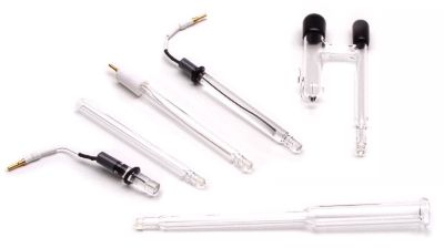 These compact, glass-bodied reference electrodes from BASi are available in two styles. The 7.5 cm long RE-5B reference electrode is used for electrochemistry experiments and is compatible with the C-3 Cell Stand, the CGME Controlled Growth Mercury Electrode Cell Stand, and the RDE-2 Rotating Disk Electrode Cell Stand. The RE-6 and RE-4 reference electrodes (3 cm) are designed for use with BASi Electrochemical Flow Cells. All electrodes have a 6 mm OD glass body, and use a porous junction (frit) made from a ceramic material (for the RE-6 and RE-4) or CoralPor™ (for the RE-5B, part number MF-2064). (Please note that due to the high resistance of the ceramic frit, the RE-6 and RE-4 electrodes are only recommended for aqueous electrolytes.)